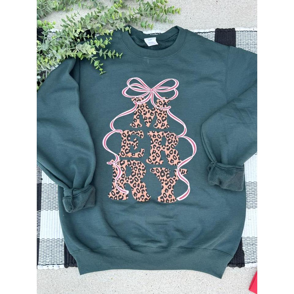 Celebrate the season in style with this Merry Leopard sweatshirt in dark green or cardinal red. Featuring a festive leopard print and a charming bow detail, it adds a playful touch to your cozy wardrobe. Perfect for holiday gatherings or casual days, this sweatshirt combines comfort with a fun, spirited look.